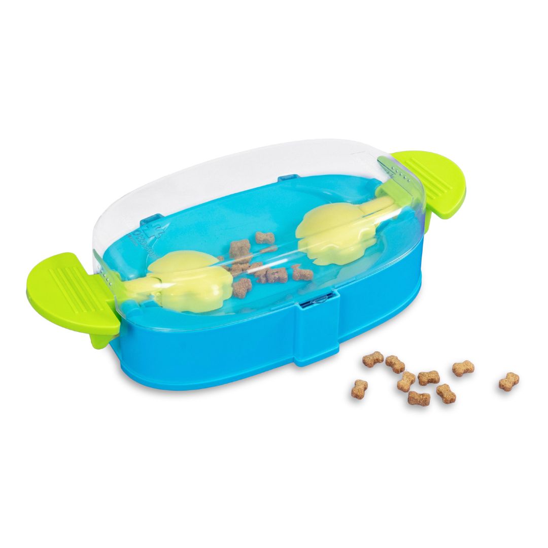 Perfect for dogs new to puzzles, the Paw N’ Play offers a delightful treat-focused challenge. Fill the large base with up to 1/3 cup of your dog’s favorite treats or food. Watch as they press the handles to move the “paws” and release the goodies.