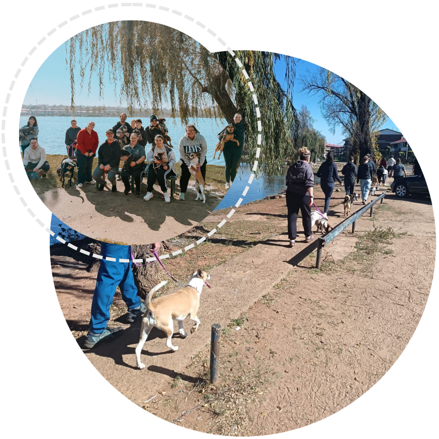 Dogs practice generalisation training—performing learned behaviours across environments and distractions. Cues include loose leash walking, recall, leave it, all leash work, and focus training.